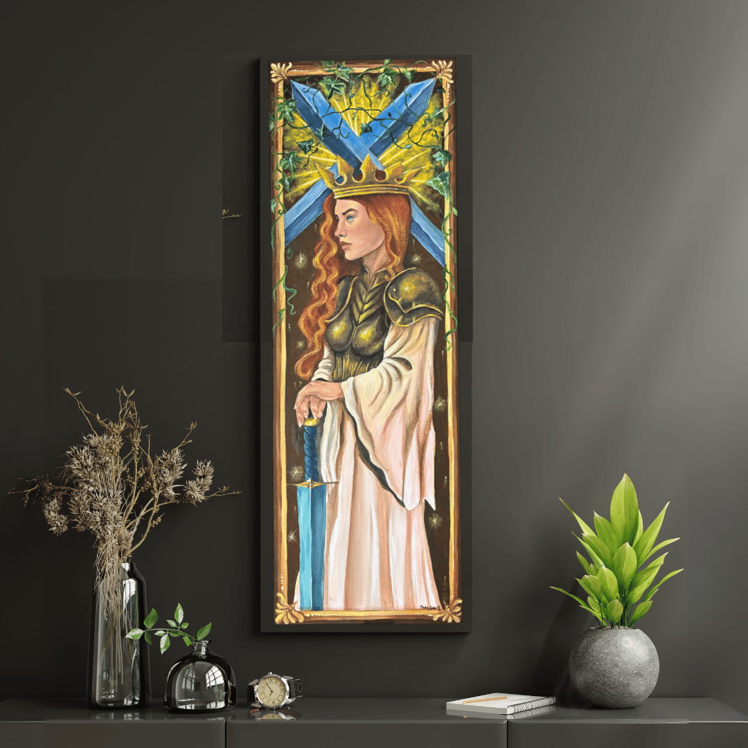 She stands calm and ready, holding her sword with quiet power. The crown and glowing swords behind her show that she’s already claimed her strength. The vines and stars remind us that this power is both grounded and magical.