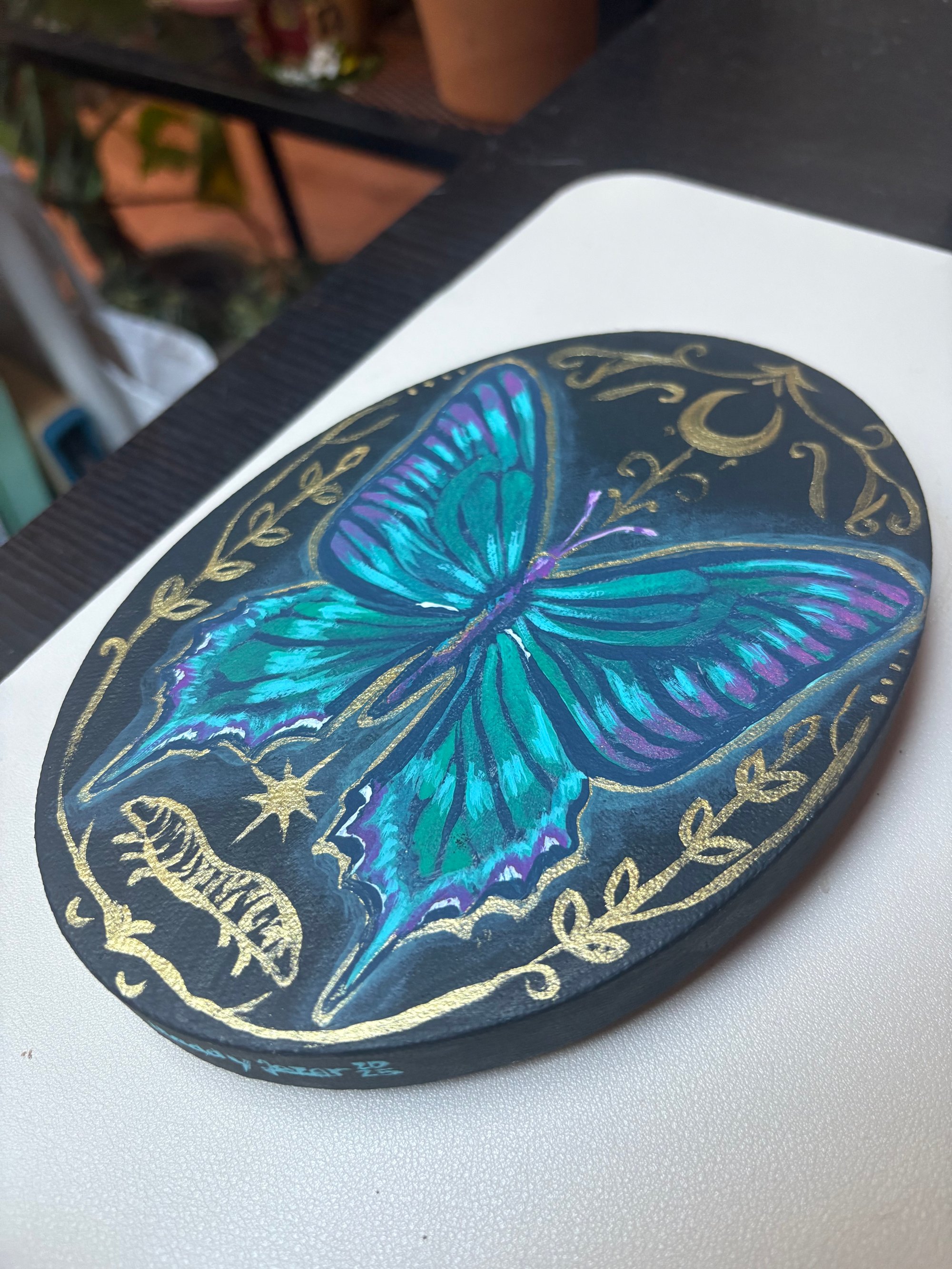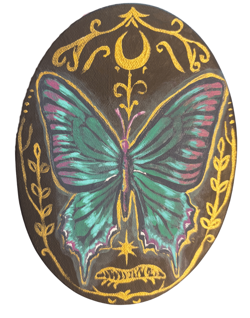 Metamorphosis" is a magical painting that represents the beauty of transformation and evolving into a new version of yourself, framed by celestial and nature-inspired gold details.