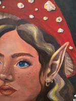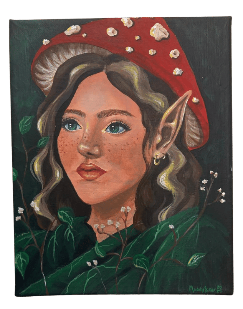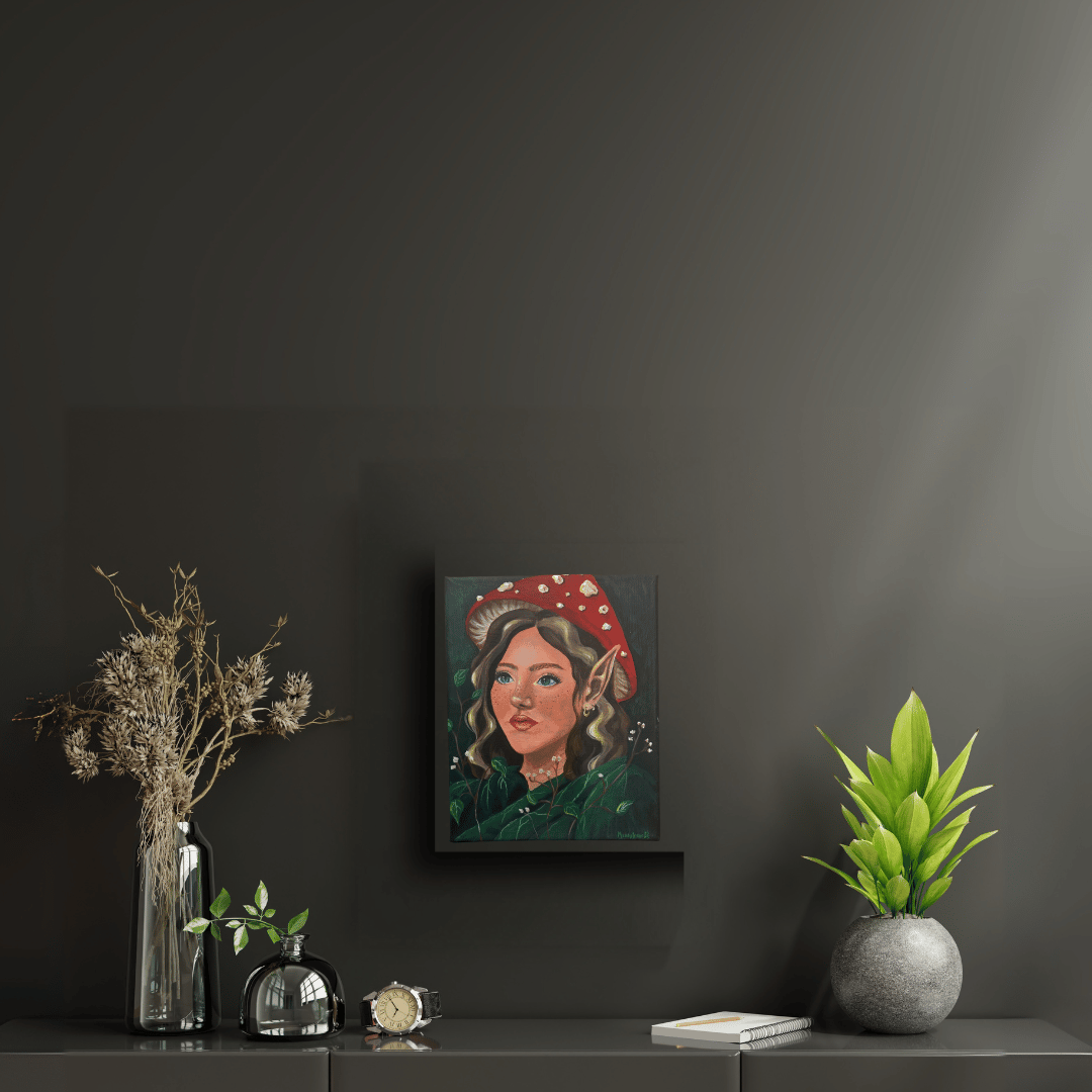 A forest spirit crowned with a toadstool, blending human grace with woodland magic. This piece celebrates the quiet beauty and mystery of nature.